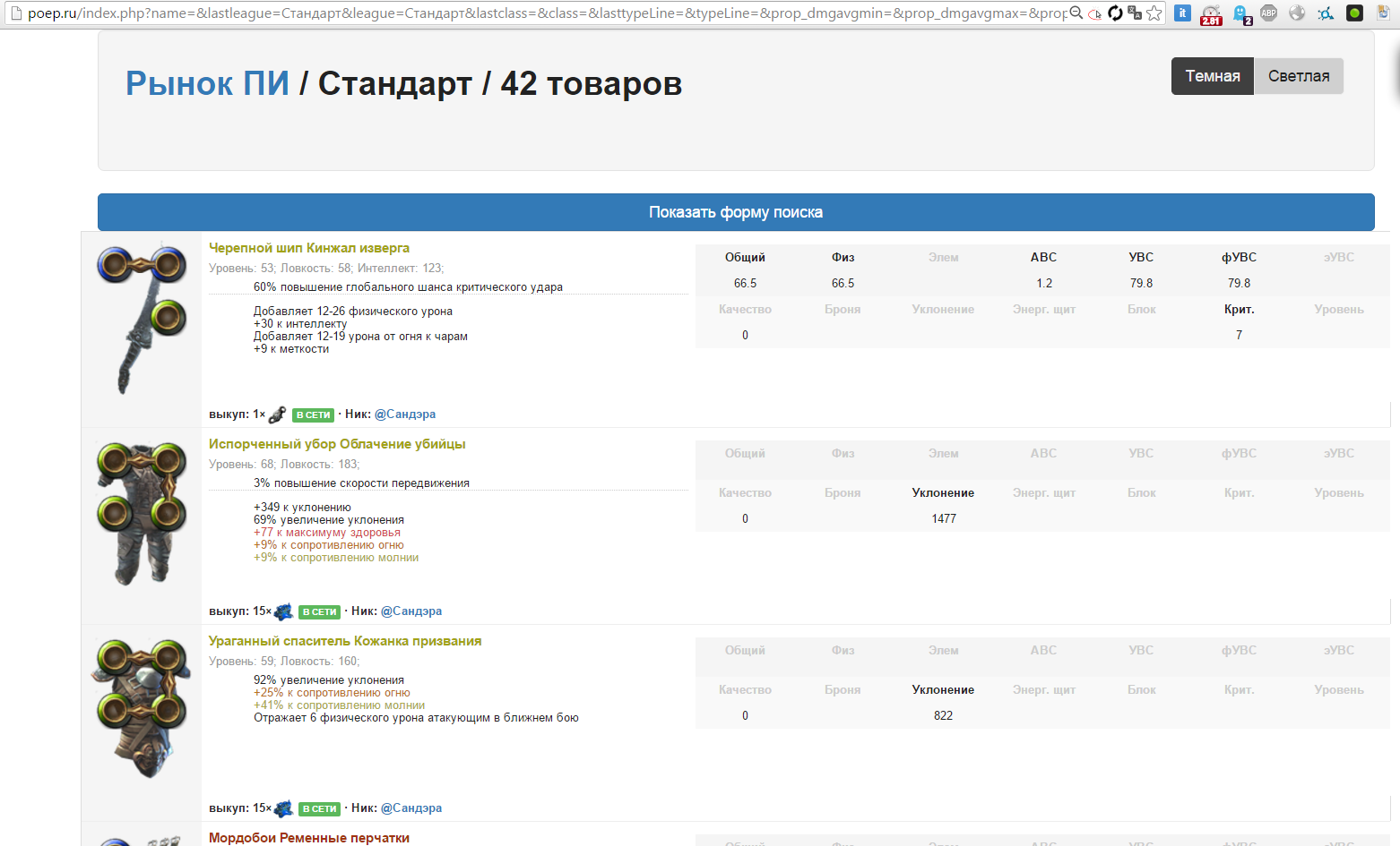 Начну с бага: сегодня (7.03.16) ДНЁМ искал шмот на СТАНДАРТЕ. Нашел, что хотел, но... на лиге ТАЛИСМАНОВ, при том, что ни то, что шмот еще не перенесли, лига не закрылась. До окончания лиги было еще часов 5, если не больше. Я и продавец были в астрале... Вопрос: для отображения "в списке" надо быть онлайн именно персонажем 81+ лвла или любым при наличии перса 81+ лвла? Если первое, то это крайне неудобно. Не так страшен мир, как его обитатели.