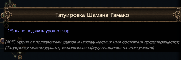 В билде будут очень полезны 2 руны и 1 татушка на сапресс (около 3 штук) Руны: эта руна позволит нам прожимать ауры реже + снизит время негативных эффектов ![]() а эта татушка идеально сочитается с нашим альтернативным восхождением мастера испытаний хаоса ![]() вот этой татушкой нужно добивать недостающий сапресс: ![]() кстати в дереве я взял мастерство сапресса что шанс сапресса удачлив не просто так. Это сделано для того что бы бегать мапы с дебафом на то что у игрока шанс сапресса меньше Интересный факт: Живая молния являясь приспешником не триггерит баф камня поддержки "Голодное остервенение" ((( это такая большая досада для меня ведь иначе бы билд смотрелся очень круто бегай я с ними... Эдакий повелитель молнии. Бафаю сильными эффектами молнии + ещ и молния оживает но увы. Если голодное остервенение заработает с живой молнией то можно будет в кольцо "Голодная петля" пихать не призрака а "Мечепад тератны" + при этом меняем уник кольцо с червяками на редкое с флатовым уроном от молнии. Последняя редакция: alexunderrrr#5111. Время: 25 нояб. 2025 г., 19:05:39