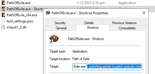 1) Нажмите правой кнопкой мыши на "PathOfExile2.exe" -> выберите "Создать ярлык" 2) Нажмите правой кнопкой мыши на созданный ярлык "PathOfExile2.exe - Shortcut" -> выберите Свойства 3) В поле "Target" добавьте "--patching-server ru-patch.poecdn.com" (как должна выглядеть строка) 4) Запустите игру, нажав на этот ярлык с параметрами. Последняя редакция: Natalia_GGG#0000. Время: 7 дек. 2025 г., 18:25:10 Last bumped7 дек. 2025 г., 18:23:40