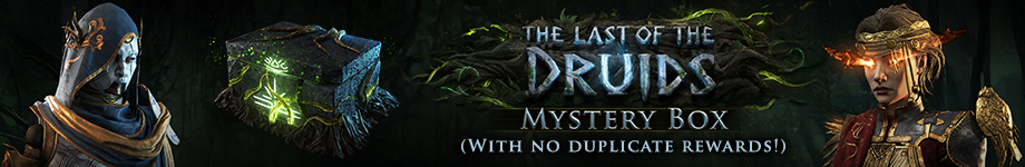 Please note that currently The Last of the Druids Mystery Box is available only in Path of Exile 2.There are more than 60 microtransactions (including variations) that you can find in The Last of the Druids Mystery Box. Many of these microtransactions have a varying number of thematic variations, and you'll never receive a duplicate copy of a variation that you have already opened. For example, if you open one variant of a microtransaction, you may later receive another variant, but you'll never get a duplicate! Because of the lack of duplicates, each box you open implicitly increases the chance of opening the remaining microtransactions you haven't received yet. Check out the full details at pathofexile2.com/mystery-box ![]() |